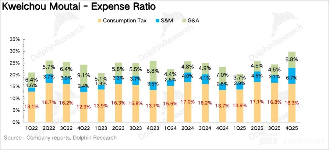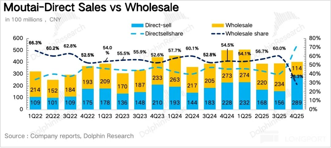 4、直营占比大幅拉升。从渠道结构来看,4Q25茅台直营渠道实现营收289亿元,同比增长27%,占比阶段性拉高到72%。在i茅台几乎不贡献收入的情况下(i茅台内部改革)海豚君推测茅台把部分原本流向批发渠道的配额投向了企业团购、线下自营体验店等直营渠道。