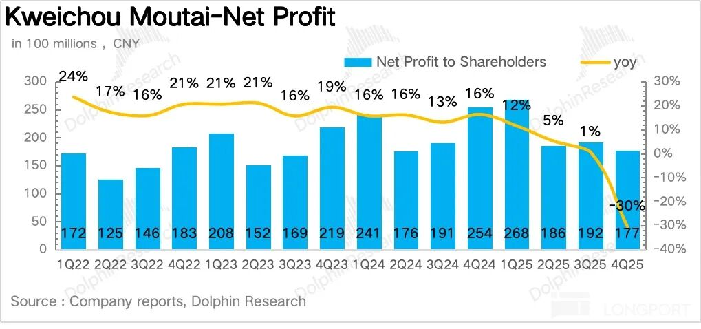 从全年维度看,2025年茅台实现营收约1720亿元,同比下降1.4%,归母净利润823亿元,同比下滑4.5%,这也是茅台上市以来首次收入&利润端双双下滑。