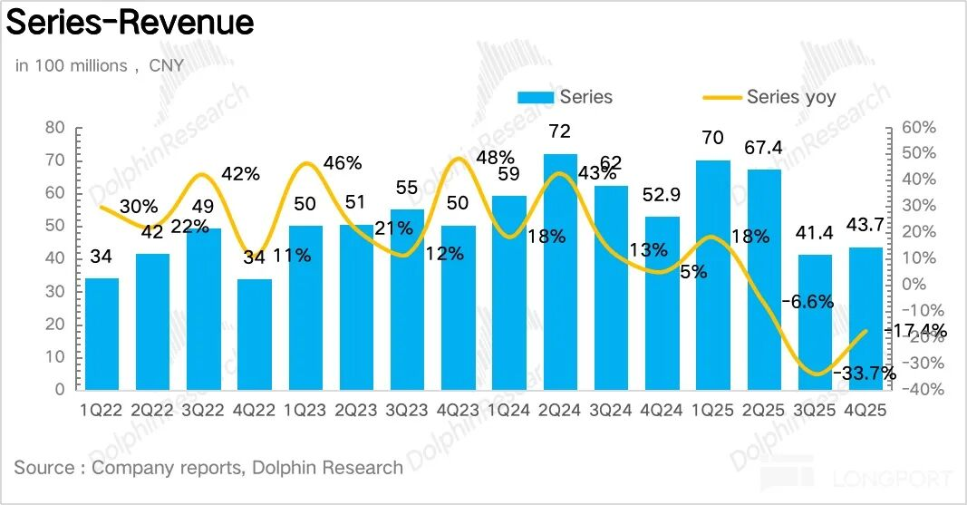 虽然王子/迎宾等大众带价盘倒挂与库存出清未完全结束,但系列酒经过前期持续去库、渠道基本回归健康水位,叠加终端动销环比改善,海豚君推测四季度表现较三季度显著修复,成为系列酒端最主要的支撑力量。2026年随着1935重新定价、渠道库存出清,系列酒有望回归正增长轨道。