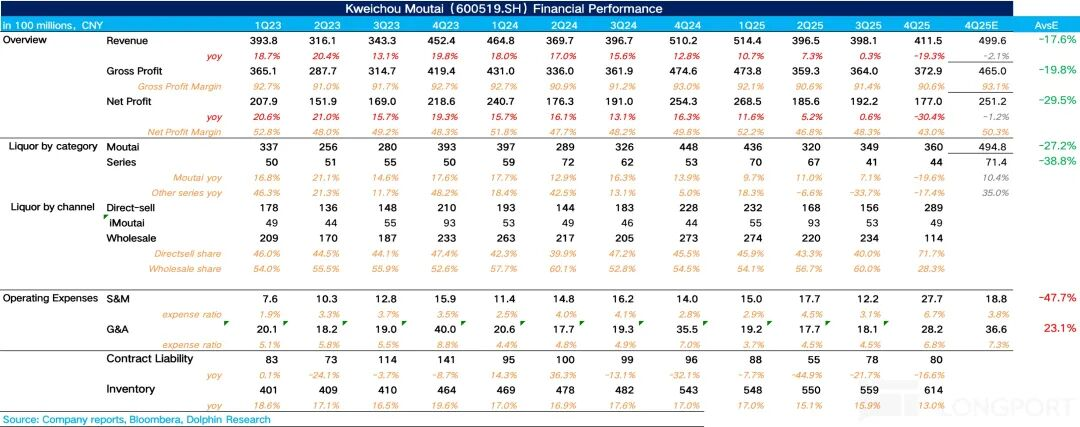 对于Q4的业绩,海豚君此前分析过,为了释放渠道压力,茅台在Q3就开始主动降速,Q4进一步放慢发货节奏,12月更是直接宣布非标减量30%-50%、停止珍品供应,并下调精品茅台和1935的出厂价。