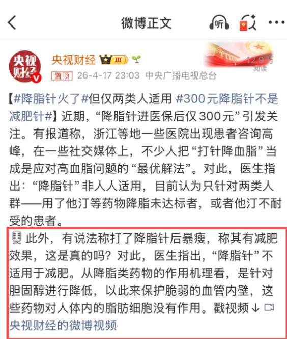 多位临床医生明确表态:降脂针是正规治疗药物,绝非减肥神针,临床至今没有打针后暴瘦的案例。央视网也发文“医生提醒:不是人人适用”。
