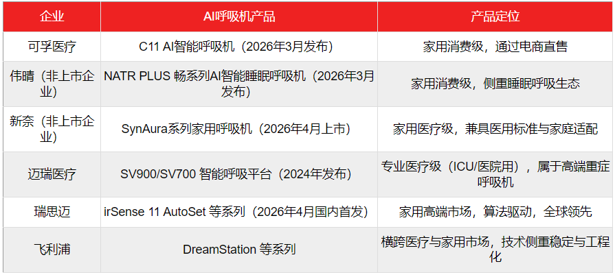 如迈瑞在2024年就已经发布了SV900/SV700 智能呼吸平台,搭载大数据模型,能智能识别5种人机不同步事件,并提供原因分析与参数调节建议。但因为是专业医疗级(ICU/医院用),属于高端重症呼吸机,虽然专业医疗领域的关注度较高,但在大众消费市场(C端),由于产品属性与普通消费者无关,市场上讨论并不多。