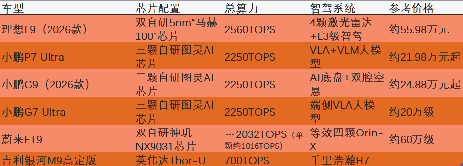 理想L9 2026款,双自研5nm“马赫100”芯片,总算力2560TOPS;小鹏P7 Ultra,三颗图灵AI芯片,整车有效算力2250TOPS;蔚来ET9,双神玑NX9031芯片,单颗1016TOPS;吉利银河M9高定版,700TOPS的Thor-U芯片。中国主流车企在20万至30万元价位段中标配L3级智能驾驶系统,智驾芯片算力突破1000TOPS已成标配。