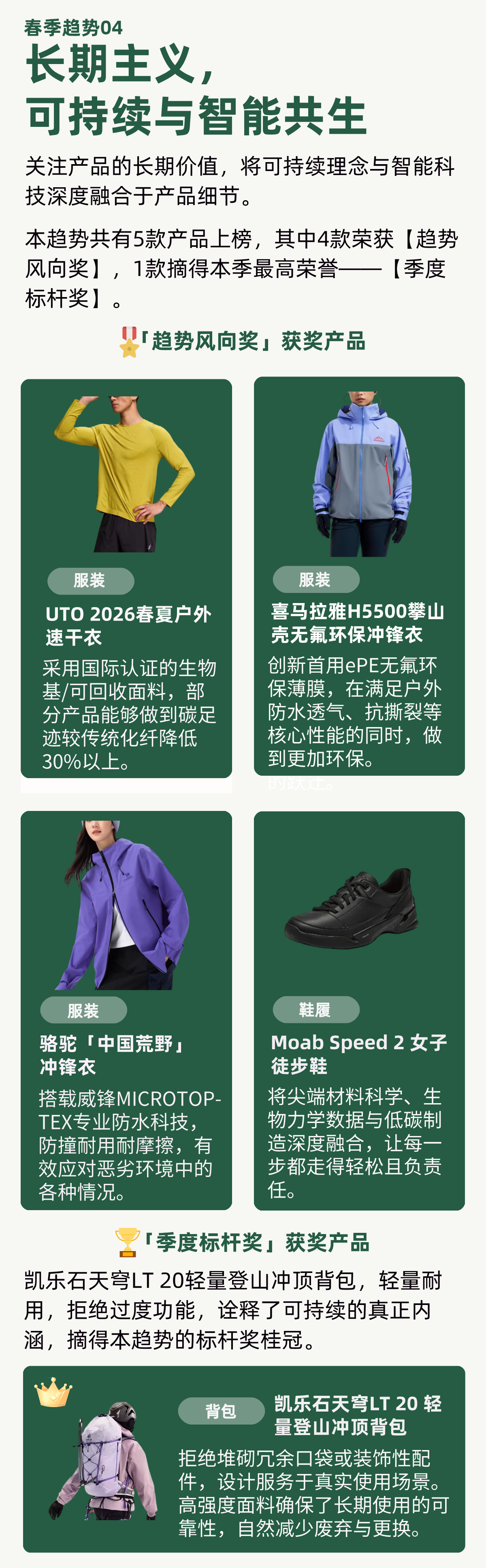 过去,“环保”意味着更高价格、更差性能、更多妥协。2026年,ePE无氟薄膜、生物基面料、低碳制造——这些技术正在成为头部品牌的供应链标配。同等性能下更环保的产品,才是真正的长期主义。
