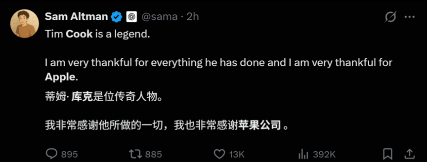 消息一出,OpenAI首席执行官山姆・奥特曼第一时间发文:“库克是位传奇人物。”