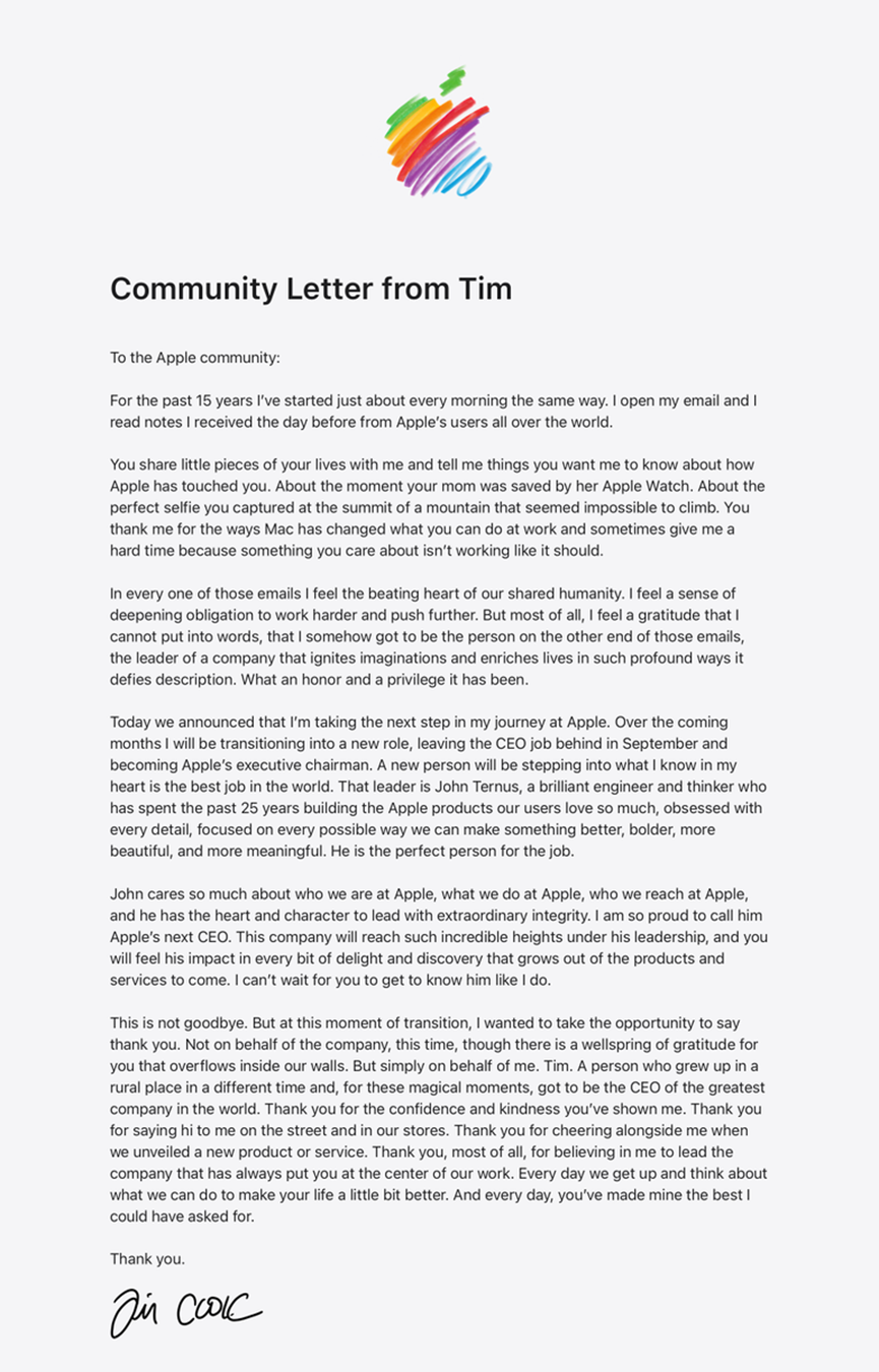 库克在告别信里写了一段话:“我打开邮箱,阅读前一天收到的来自世界各地苹果用户的来信。你们与我分享生活中的点点滴滴——母亲被Apple Watch救了一命,在看似无法攀登的山顶拍下的那张完美自拍。”