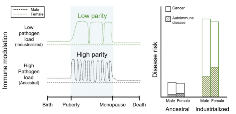 图2工业社会与古代社会两性间免疫力与疾病风险对比。古代(ancestral)社会中,病原体负荷高(high pathogen load),女性生产次数多(high parity),而工业(industrialized)社会中则相反。低病原体负荷会同时影响男性和女性的免疫功能,导致自身免疫病(autoimmune disease)风险的升高,而低产次只影响女性的免疫系统,加剧自身免疫病在性别间的差异。|图源:参考文献[15]