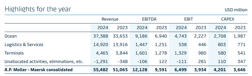 马士基各板块营收,总营收554.82亿美元,航运营收373.88亿美元,占67.38%。图表来自马士基2024年年报