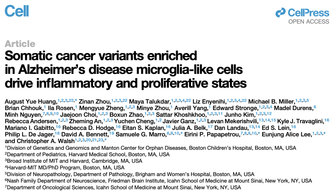 该研究于2026年4月21日发表在了Cell期刊,论文题为:Somatic cancer variants enriched in Alzheimer’s disease microglia-like cells drive inflammatory and proliferative states。哈佛医学院波士顿儿童医院黄岳教授为论文第一作者兼共同通讯作者、Zhou Zinan等人为论文共同第一作者。
