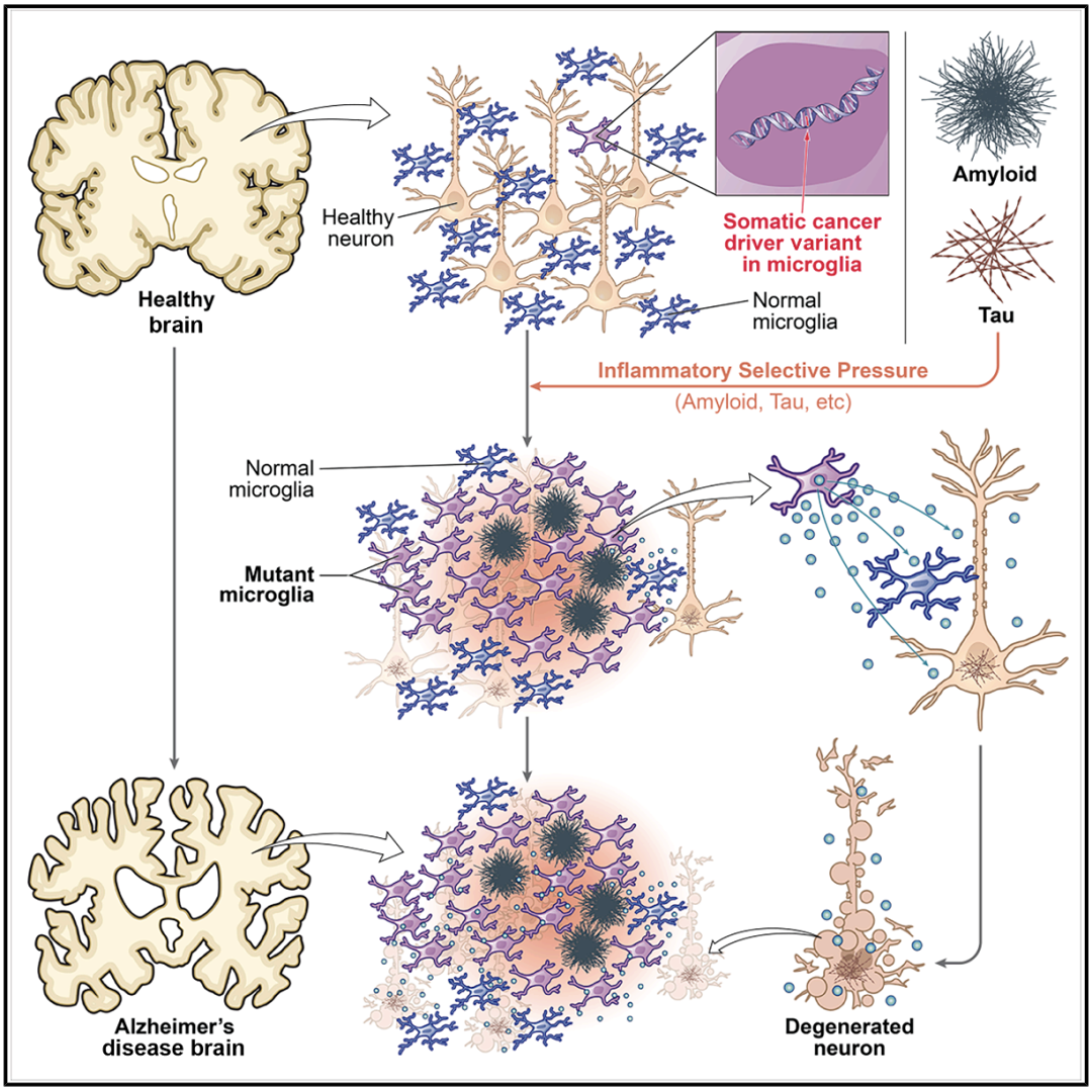 而现在,国际顶尖学术期刊Cell发表的一项突破性研究,为我们理解阿尔茨海默病打开了全新视角——癌症驱动基因突变竟然在阿尔茨海默病患者的大脑免疫细胞中异常富集,并驱动这些细胞走向炎症和增殖状态,从而可能加剧神经退行性病变。