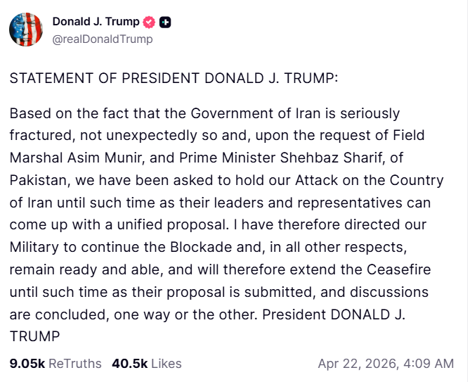 (图片:唐纳德·J·特朗普总统声明:伊朗政府目前已陷入严重分裂,这一点并未出乎预料。应巴基斯坦陆军参谋长穆尼尔元帅与夏巴兹·谢里夫总理的请求,美方暂缓对伊朗发起打击,直至其领导层与代表方能够拿出统一的方案。据此,我已指示美军继续维持封锁,并在其他各方面保持高度戒备与作战能力。现决定延长停火,直至伊朗提交相关方案、相关谈判无论以何种方式结束为止。——唐纳德·J·特朗普总统)