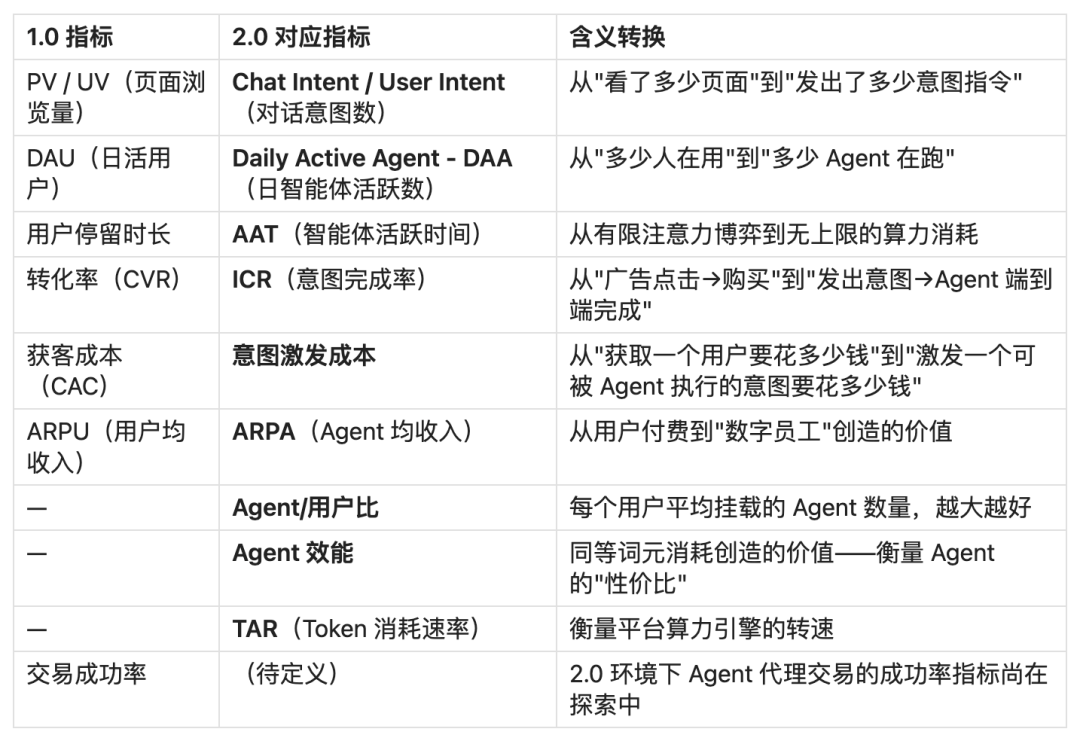 几个新指标的含义是:Chat Intent是 PV 的 2.0 对标物,从被动曝光计量变成主动意图表达,商业价值密度远高于 PV。意图激发成本是 CAC 的升级,核心挑战从获客变成激发可被智能体执行的明确意图。智能体/用户比是 2.0 独有的增长杠杆指标,一个用户可以创建多个 智能体并衍生子智能体,这个比值的增长速度可能是判断平台是否进入 2.0 增长曲线的关键先行指标。智能体效能衡量同等词元消耗下创造的价值,防止陷入“词元消耗量崇拜”。