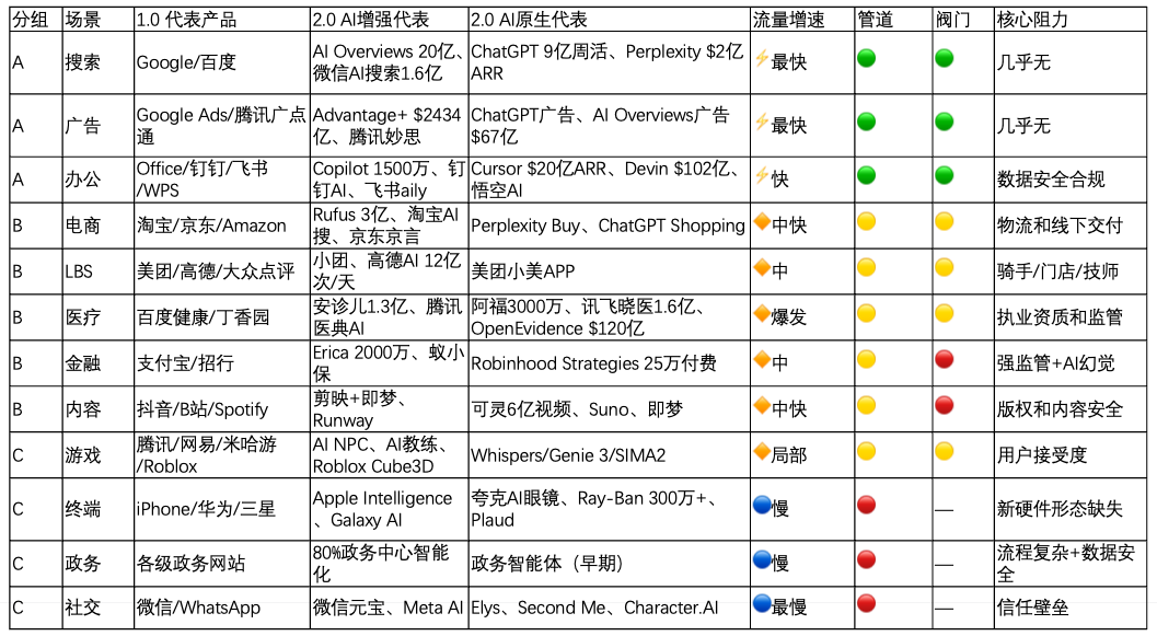 这六个场景的共同特征是:涉及线下服务商体系,或涉及版权保护、特殊或阶段性重点监管。这意味着即使 AI 技术已经达到应用水平,流量从 1.0 到 2.0 的转化速度仍受到非技术因素的制约。但阻力不等于阻断——这些场景的转化启动规模已经在扩大,局部已出现爆发。