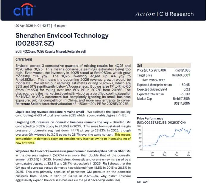 花旗4月20日发布报告则指出,英维克连续三个季度业绩不及预期,这表明市场对其的一致盈利预期过高。更值得警惕的是,公司2025年末存货9.83亿元,同比仅小幅增长11%;2026年一季度存货11.82亿元,同比仅微增4%,这意味着2026年二季度营收增长仍将偏弱。当前市场仅将英维克视为英伟达、ASIC芯片客户的认证液冷供应商,却完全忽视其液冷业务体量偏小、国内市场价格竞争激烈、行业新进入者持续增加等问题。基于估值因素,将公司目标价从50元人民币升至60元人民币,重申卖出评级。