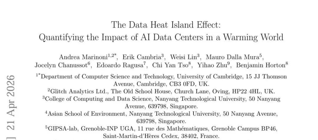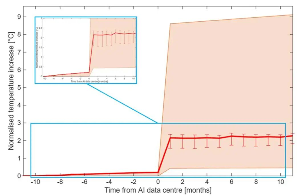 近期,一项由剑桥大学牵头、联合欧洲与亚洲多所高校研究人员完成的研究显示,在AI数据中心投运后,其周边地表温度平均上升约2°C,影响范围可延伸至约10公里。该研究横跨计算机科学、地球科学与环境科学,目前仍为未经同行评议的预印本结果。