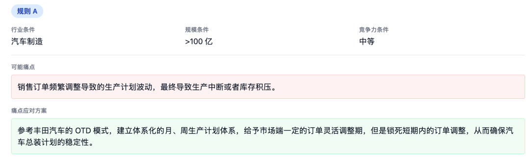 if行业=汽车制造and销售规模>100亿and竞争力=中等then痛点=销售订单频繁调整and应对方案=丰田汽车OTD模式