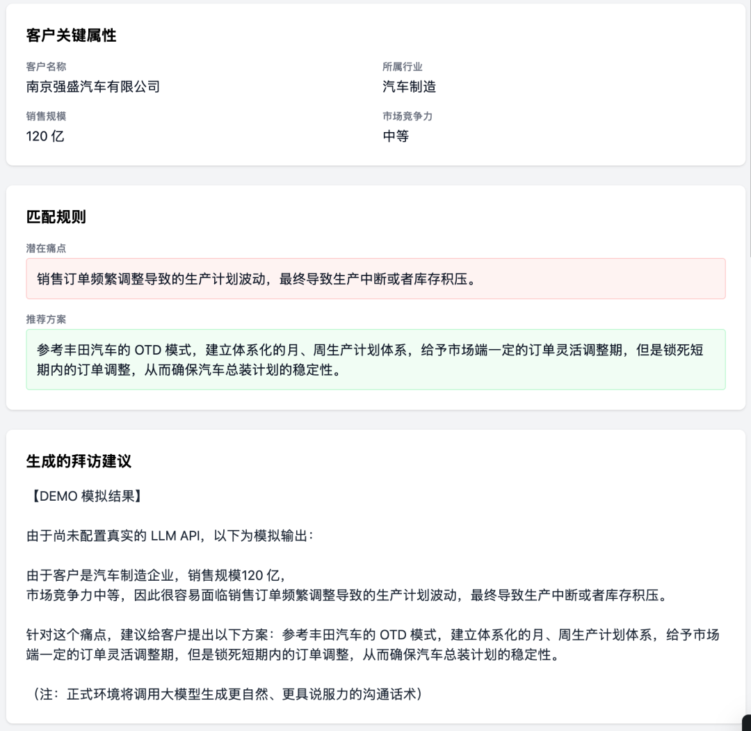 比如:如果客户是年销售额超过100亿的汽车制造企业,同时市场竞争力属于中等水平,那么其生产管理的核心痛点大概率包括“订单频繁变动导致的生产缺料和库存积压”。