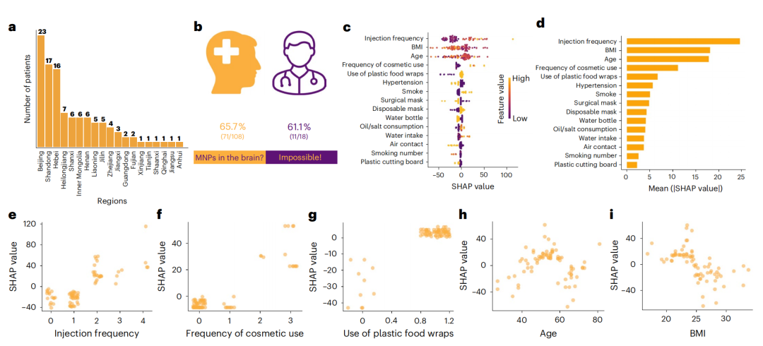 研究团队进一步探究了脑肿瘤大脑中微塑料/纳米塑料峰度升高的因素及暴露途径,结果显示,丰度升高相关的前五大外部暴露因素为:医疗注射频率、体重指数、年龄、化妆品使用频率以及塑料保鲜膜使用情况。