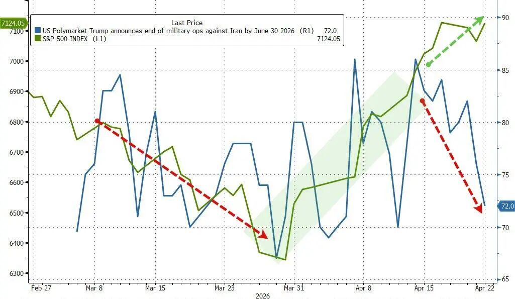 据彭博,政治预测平台Polymarket关于"6月30日前军事行动结束"的概率已在近日明显回落,而标普500同期却冲上历史新高,两者之间的裂口正在扩大。