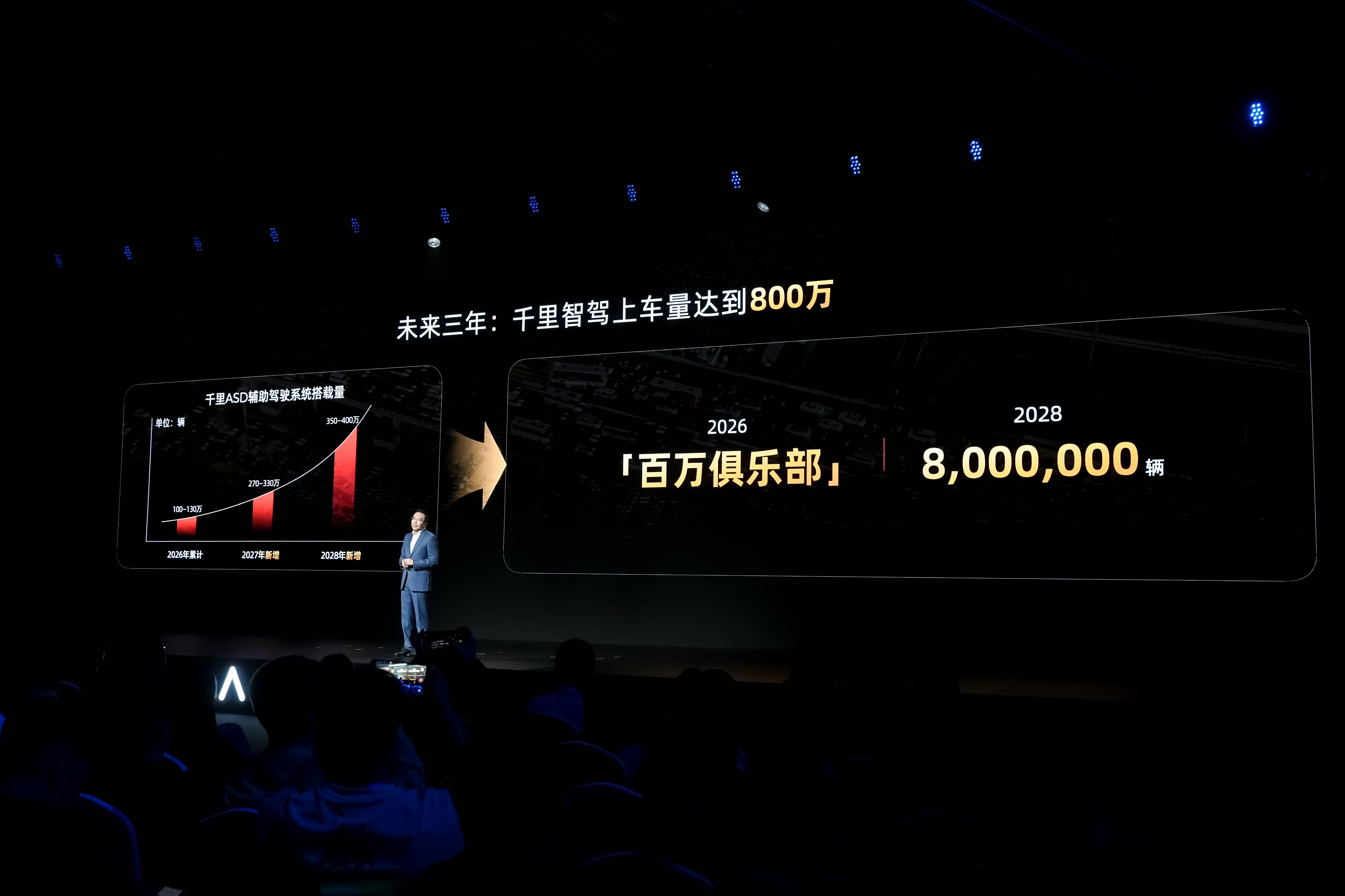 赵明当天的发言火力全开:千里科技46万辆装车,2026年百万目标,2028年800万辆的宏大叙事,与阶跃星辰联手打造原生智驾基座模型,Robotaxi明年落地等等,一条条数字砸下来,气势十足。