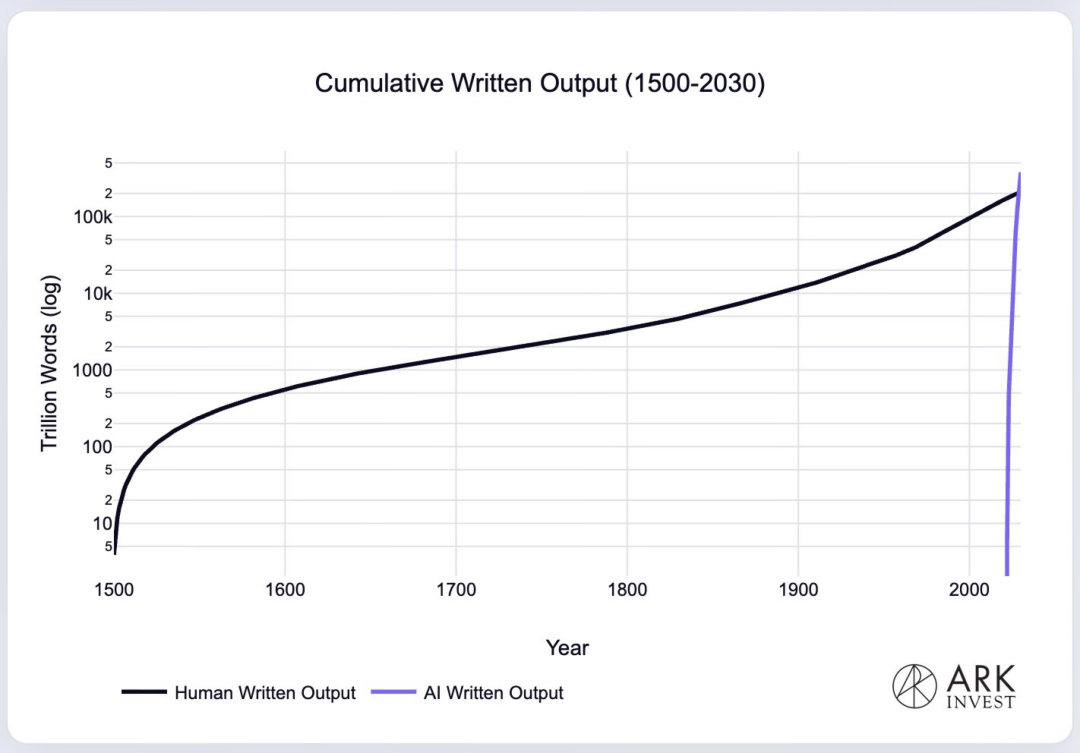 在这张对数坐标系的图表上,展示了自1500年(古腾堡印刷术普及后)至2030年全球年度文字产量的变化。