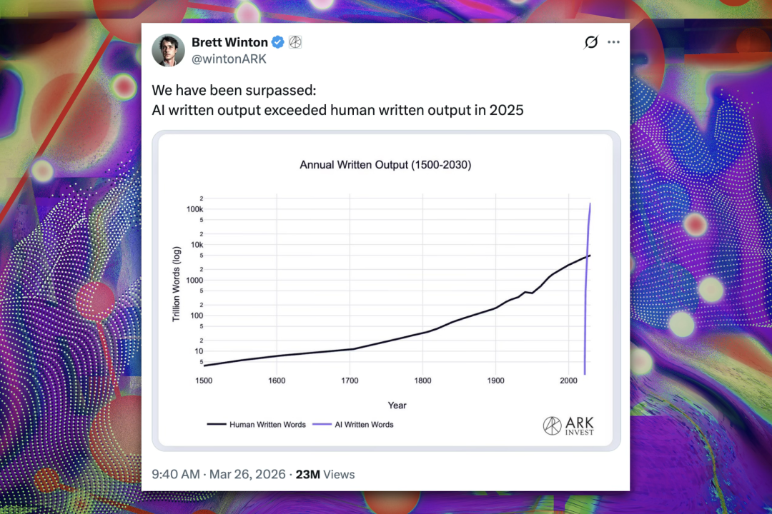 Winton甚至给出了个更大胆的预测:到2020年代末,AI的“累计”文字产量(包含所有备忘录、白皮书、商业文档、社交动态),将彻底超越人类自有文明以来的文字总和。