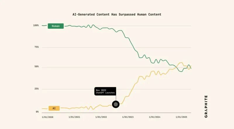 在2024年11月,AI生成的网络文章数量就已经首次超过了人类手写文章。到了2025年中期,新增网页中AI生成内容的比例已经逼近甚至超过50%。