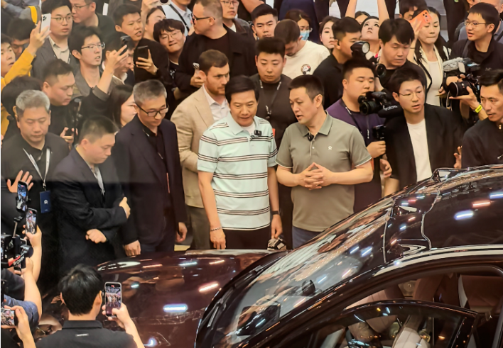 李斌与雷军交流;图源:虎嗅拍摄