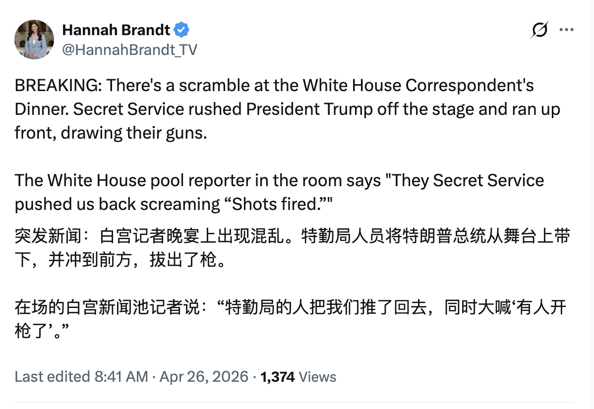 本文来自:华尔街见闻,作者:叶桢,原文标题:《特朗普被紧急疏散!白宫记者晚宴大厅发生枪击事件》,题图来自:视觉中国