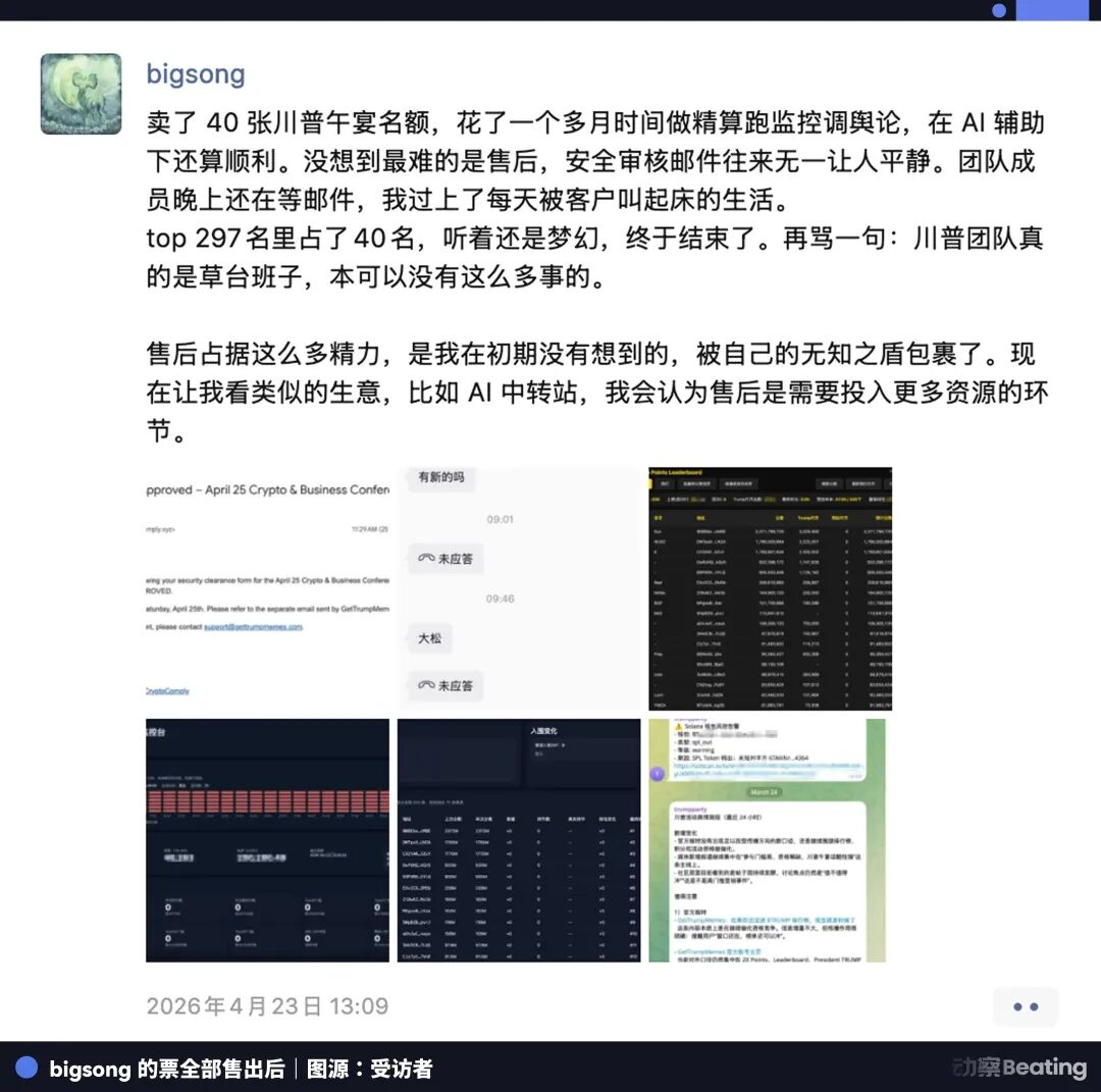特朗普的商业合作伙伴赞克尔说,他要说服总统每六个月办一次。bigsong明年或许也要做“包过套餐”,不仅帮买票的人拿到积分排名,还会帮持币人通过安全审查。Sherry的群里,已经有人开始预定明年的票。供给侧和需求侧正在同步升级,一条从生产、销售、售后到复购的完整产业链成型了。
