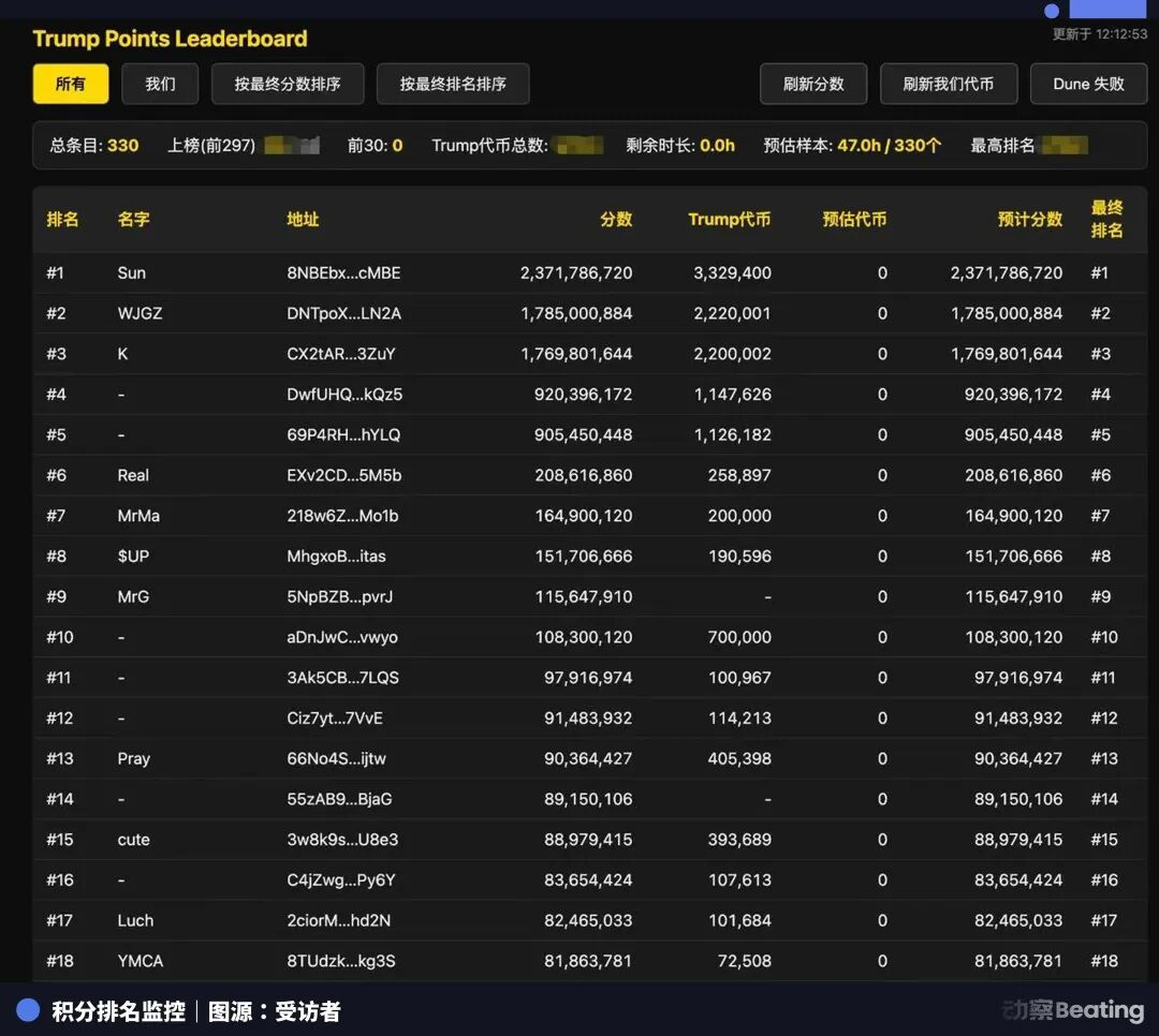 积分只统计链上地址和Robinhood账户的持币量,放在其他交易所的不算。这意味着真正参与排名竞争的地址数量远少于TRUMP币的总持有人数。再加上积分是时间的函数,越早进场优势越大。