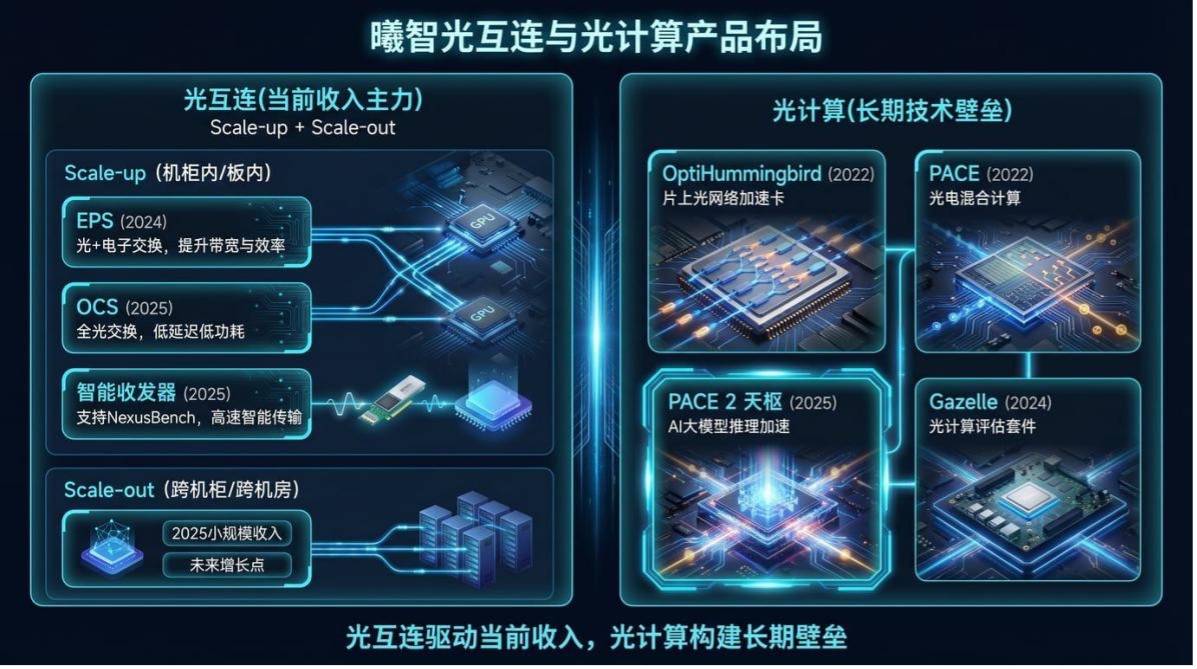 曦智如今的产品线主要是两条,一条是光互连,一条是光计算,当下由光互连扛起营收,未来靠光计算构筑壁垒。