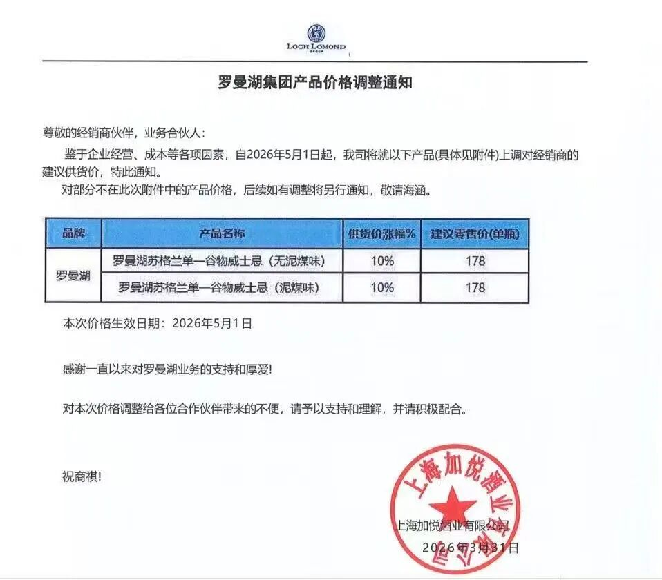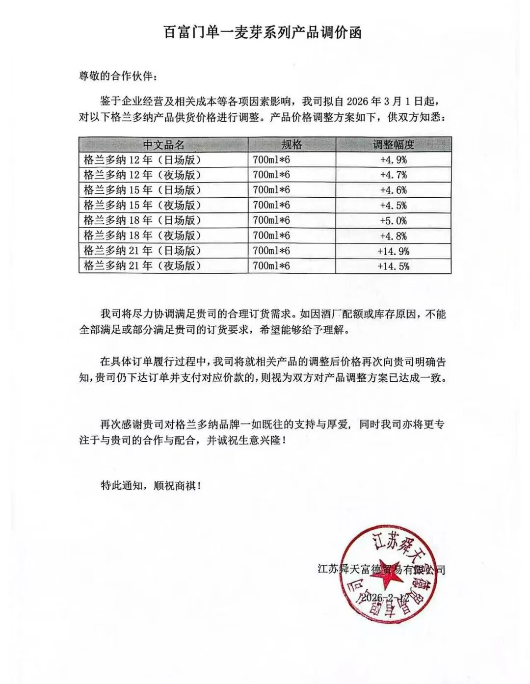 提价通知显示:3月1日起,格兰多纳12年、15年、18年、21年分别针对日场版和夜场版提价,涨幅在4.9%—14.9%之间;5月1日起,罗曼湖单一谷物威士忌(含泥煤味与无泥煤味两款)均上涨10%。