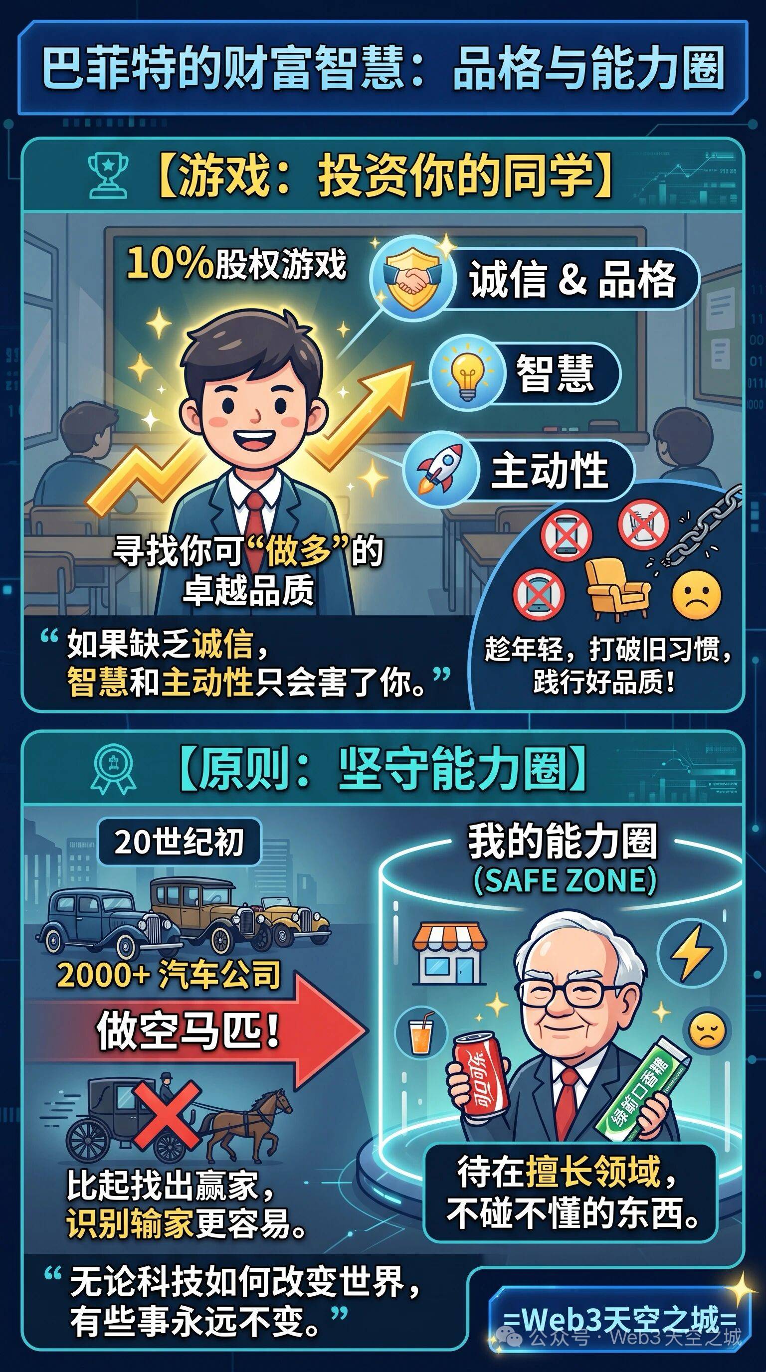 巴菲特向听众提出了一个有趣的思维实验:如果可以挑选一位同学,并获得其未来余生收入的10%,你会选择谁?他指出,最终胜出的往往不是智商最高或背景最深的人,而是那些具备正直、诚实、慷慨等后天品质的人。