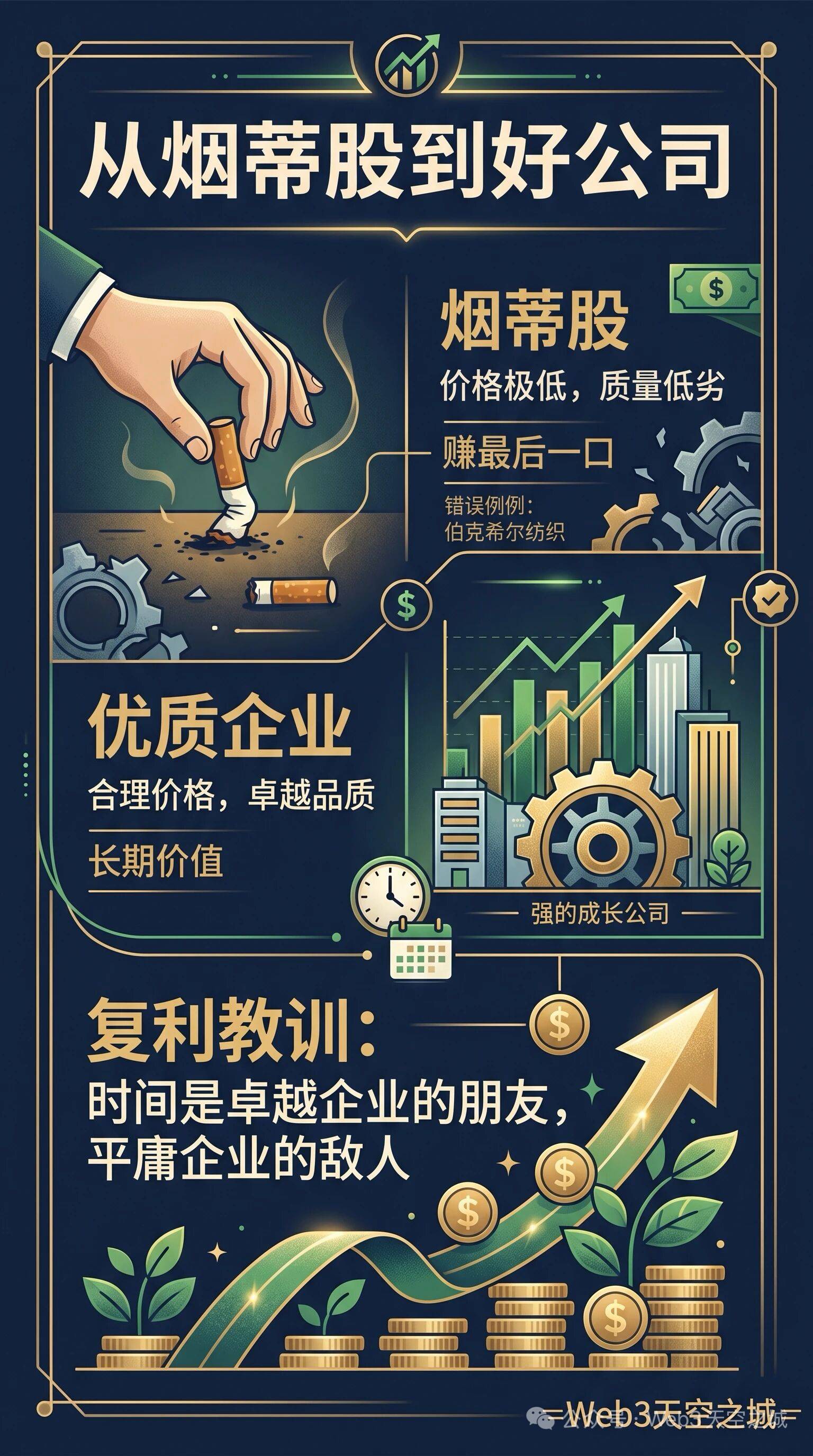 作为一名成功的投资者,巴菲特并不避讳谈论失败。他坦言,收购伯克希尔·哈撒韦本身就是他人生中最大的错误之一,因为那原本是一家糟糕的纺织企业。他曾痴迷于格雷厄姆式的“烟蒂股”投资法,即寻找那些廉价到可以“免费吸一口”的企业,但这些企业往往无法实现复利增长。