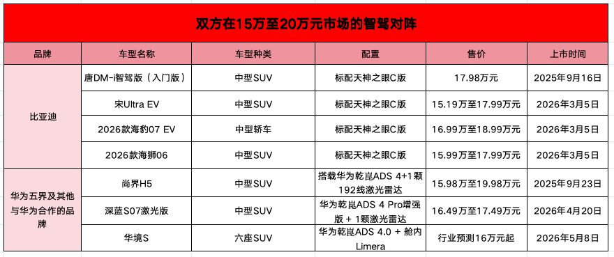 这意味着,比亚迪的天神之眼C版与华为乾崑,会在15万至20万元的区间,以智驾为武器展开交锋。