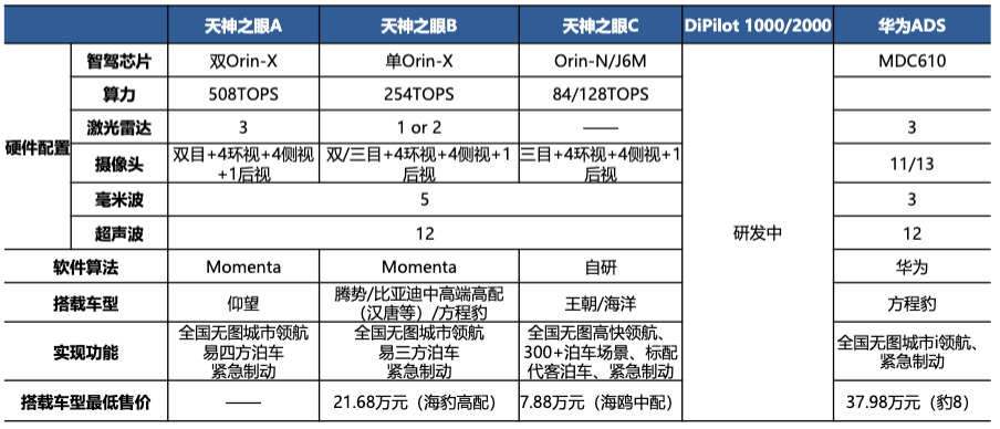 但其短板也很明显,激光雷达的缺失会使其难以应对城区复杂的感知场景,所以天神之眼C版并不支持城市NOA,而这一技术在三年前就开始普及了。