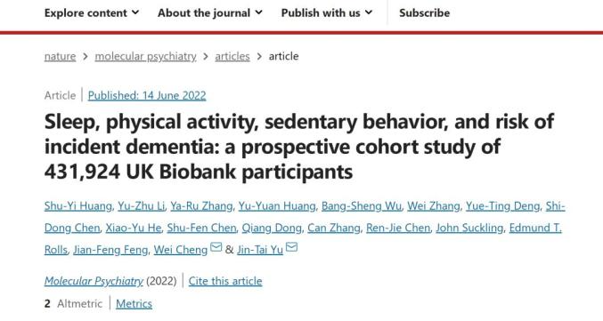 [4] Huang, et al. (2022).Sleep, physical activity, sedentary behavior, and risk of incident dementia: a prospective cohort study of 431,924 UK Biobank participants.Molecular Psychiatry.
