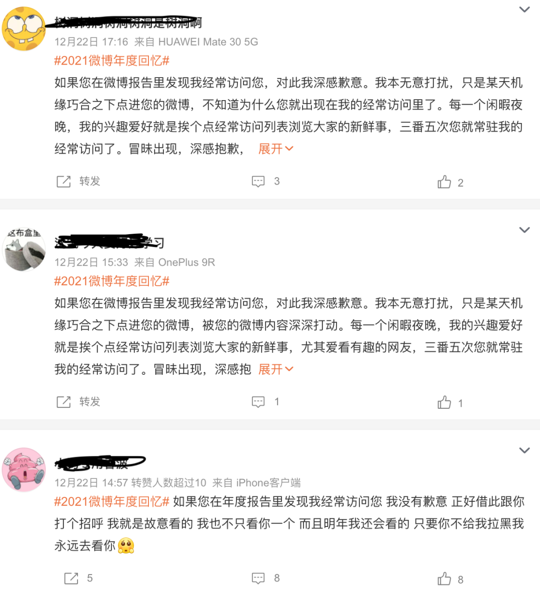 例如一部分社交软件,就忽略了当代人对社交私密性的需求:在这几年的年末,微博上总会有“微博年度报告能看访客”的流言出现。搞得各位人人自查,开始发表一连串“无意冒犯”宣言。