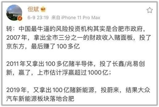 合肥市委书记在接受央视采访的时候,被问到赚到了么,一脸满足的点了点头,其实这些赚到的钱也是进入一个叫“合肥芯屏产业投资基金”的地方,等待下一轮投资,这些政府班子真的厉害了。