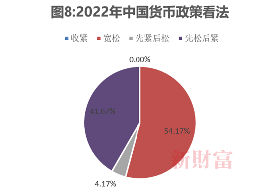 货币政策方面,私募看法较为一致。没有私募选择2022年中国货币政策收紧,普遍认为货币政策将宽松,只是对货币政策的节奏有不同看法。54.17%的私募直接选择中国货币政策宽松,为最主要群体。41.67%的私募选择货币政策先松后紧,4.17%的私募认为是先紧后松(图8)。