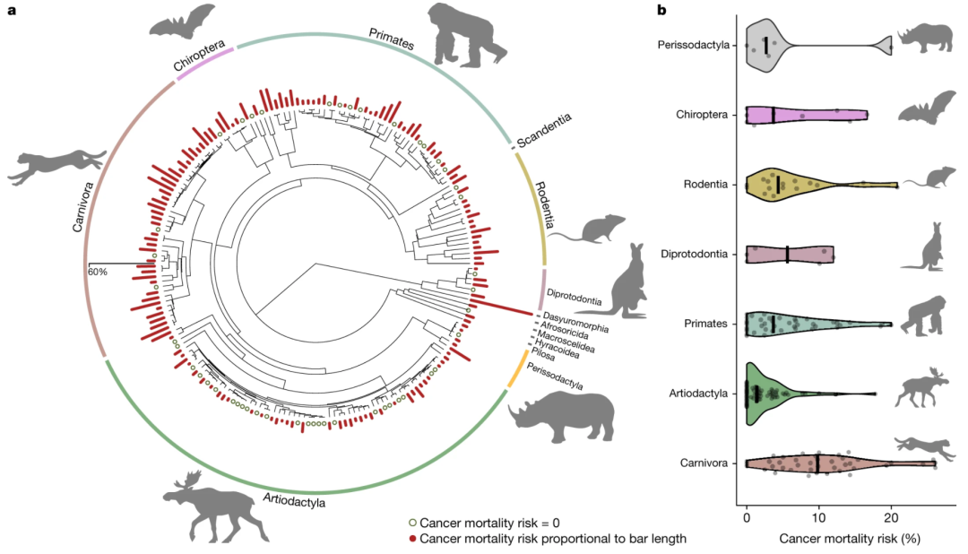 近期,蒙彼利埃大学科研团队在《自然》杂志发表论文,他们研究了191种动物的疾病数据,发现动物因癌症死亡的风险与物种的体型和寿命关系不大,更主要的影响因素是饮食成分。肉食动物,尤其是以哺乳动物为食的物种,面临着最高的癌症相关死亡率[1]。