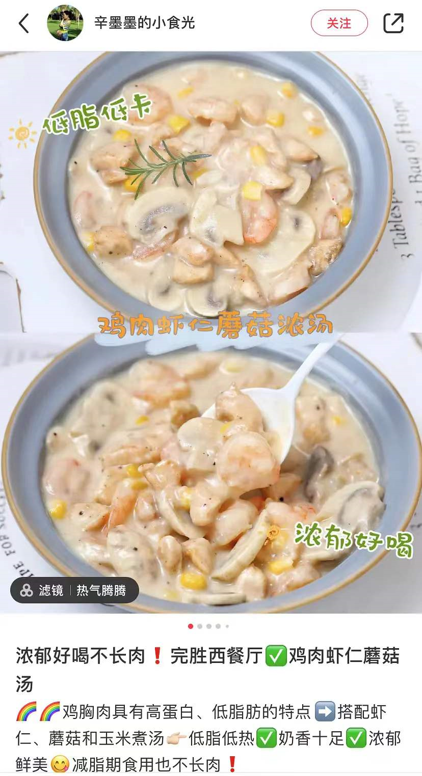 原身其实是鸡肉虾仁蘑菇汤,丝滑浓郁的乳白色奶油浓汤暖心暖胃,口蘑脆嫩、虾仁弹牙,作为一道日常的减脂料理还是不错的。但炒小麦粉这个步骤对于厨房小白来说可能还是有点难以把控,一不小心就糊了。