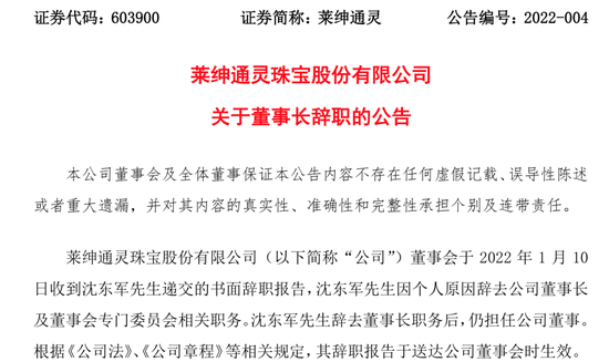 1月10日晚间,莱绅通灵公告:沈东军宣布辞去董事长职务,马峻则“重出江湖”,全票当选董事长。