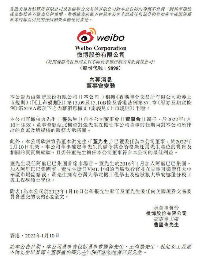 @界面快报【微博:张勇自董事会辞任,董本洪已获委任为公司董事】1月10日,微博在港交所公告,公司宣布张勇自公司董事会辞任,于2022年1月10日生效。此外,公司宣布董本洪已获委任为公司董事,于2022年1月10日生效。