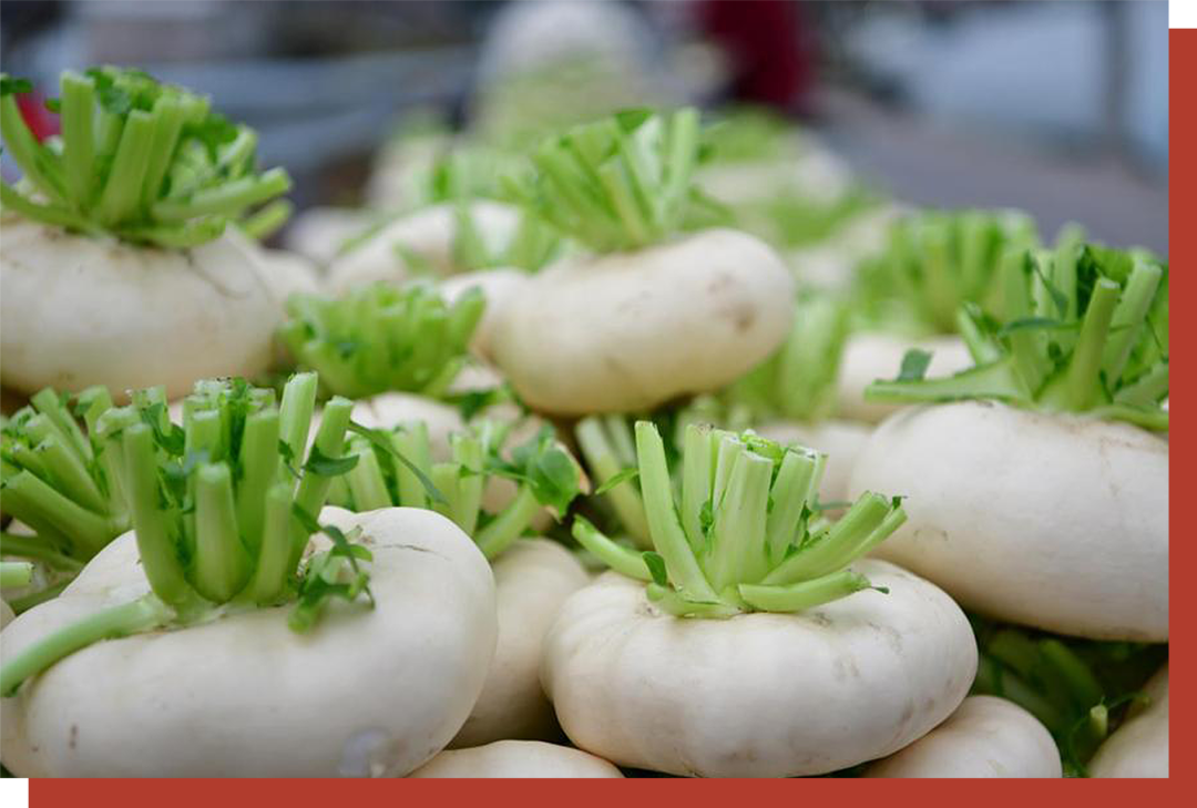 这颗扁萝卜的学名叫作芜菁,又名盘菜、蔓菁,变萝卜,也叫恰玛古。在东北、华北、西北等地,亦可见它的一抹身影,盛产于春、夏、秋三个季节。只有被温州人改良种植后的芜菁,才会盛产在冬季,呈浮白翠绿之意。其实盘菜,在温州栽培已经有一百八十多年了。20 世纪 30 年代,以瑞安梓岙为中心延至周边几个地区。反复种植盘菜的土壤变得结板、坚硬,在没有轮种其它农作物的情况下,导致本地出产的盘菜一度不复之前细润、味甜、质清,让食客们对它的热爱由浓转薄,一度造成盘菜薄利滞销,甚至被动退出温州市场。