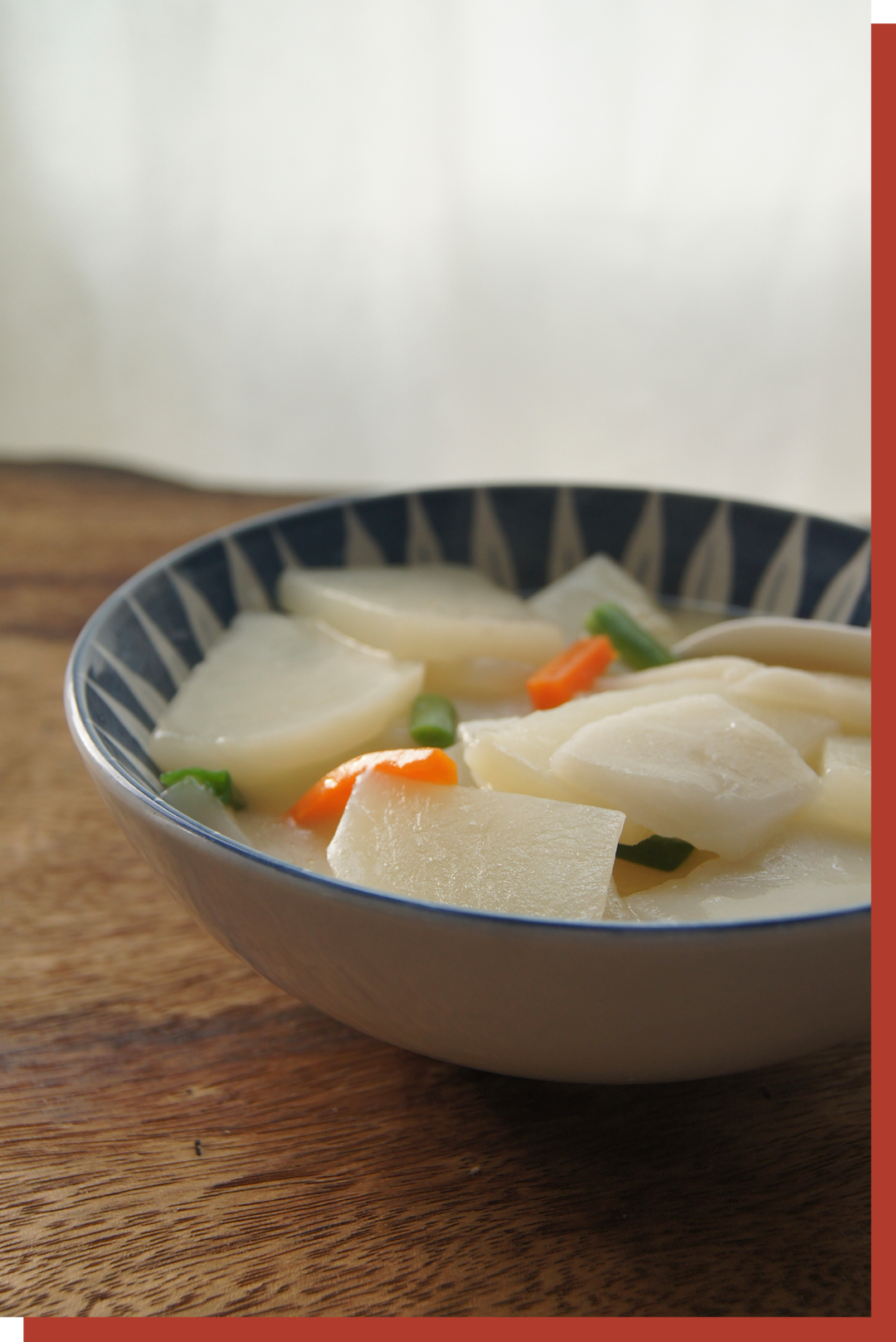 一盘腊肉盘菜年糕端上桌,让人一时分不清楚到底哪一根是年糕条,哪一根才是盘菜条,只得搛一筷子入口,咀嚼之下才发觉筋道弹牙的是年糕,糯甜松泛的是盘菜条儿。而椭圆薄片状的年糕宜和大白菜、小虾皮一起做汤糕,碗底在年糕片的承托下,浮现一抹乳白色,在翠莹一抹湛亮的小青菜和掐粉嫩尖的小虾皮的助攻下,光是瞧着就秀色可餐。