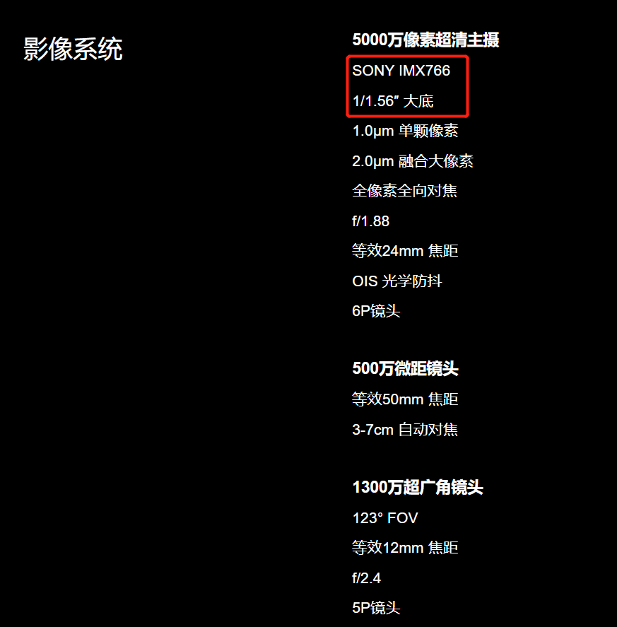 IMX766 的 5000W 像素匹配的 1/1.56 的传感器尺寸,真不知道拿什么和一亿像素 1/1.33 的大底来比。