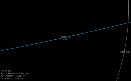 格林威治时间(GMT)2019年7月25日凌晨1时22分(北京时间9时22分),一颗名为“2019OK”的小行星以大约8.7万千米每小时的速度掠过地球,最终以0.00048个天文单位(一个“天文单位”即地球和太阳之间的距离)的距离“擦”过地球,距地球最近时距离只有71806千米。