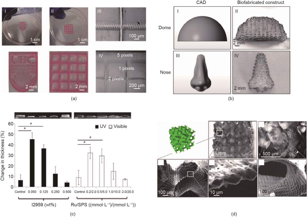 图8(a)可见光诱导立体光刻法制备水凝胶结构。转载自参考文献,经IOP Science许可,©2015。(b)GelMA/Col水凝胶打印的具有连通孔的3D 结构。转载自参考文献,经American Chemical Society许可,©2016。(c)不同引发剂引发的GelMA/Col水凝胶厚度变化比例。Ru:[Ru(II)(bpy)3] 2+。转载自参考文献,经American Chemical Society许可,©2016。(d)螺旋二十四面体,展现打印的复杂程度。*:P < 0.05。转载自参考文献,经IOP Science许可,©2019